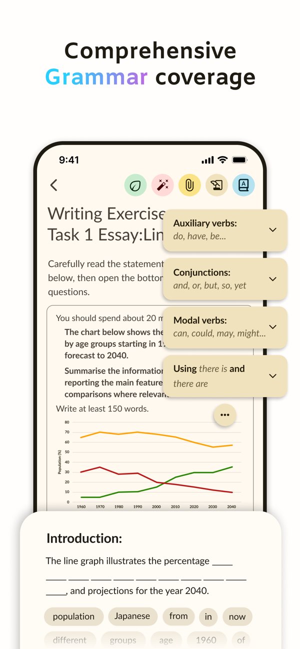 Built-in grammar resources cover the structures that matter most in IELTS Writing and Speaking - with clear explanations, real examples, and linking word banks to make your language more precise and persuasive.